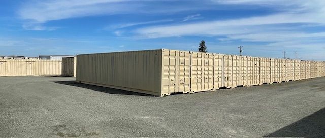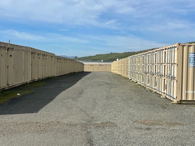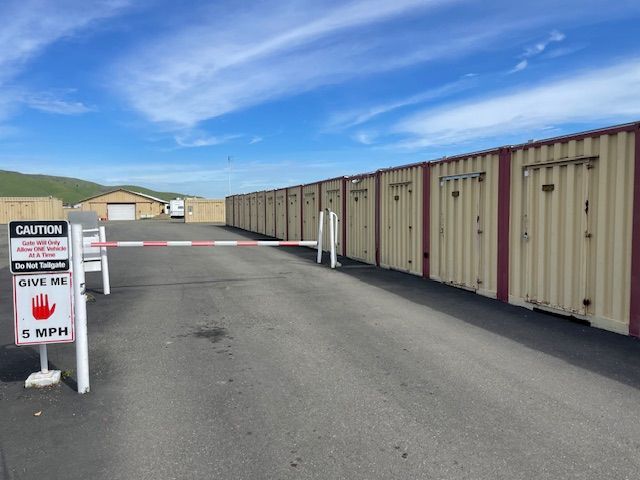 Storage units behind a chain-link fence on a gravel lot under a clear blue sky.