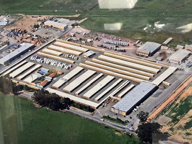 A car parked in front of a building with trailers parked on the right. Blue sky and greenery are in the background.